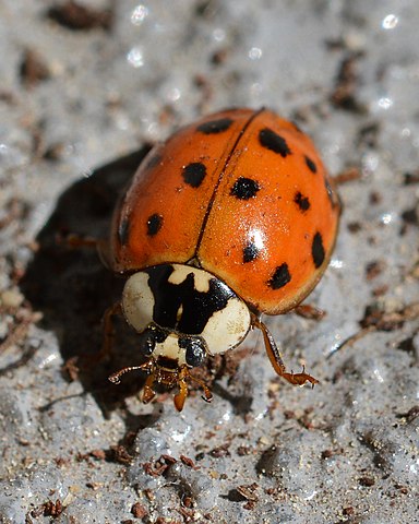 Asian beetles, also known as lady beetles or ladybugs, are small, dome-shaped insects with distinctive spots on their wing covers. They vary in color from yellow to red and can have multiple spots or none at all.